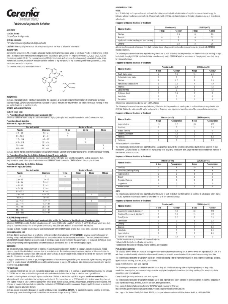 It should be given orally at a minimum dose. Web administer cerenia tablets orally at a minimum dose of 8 mg/kg (3.6 mg/lb) body weight once daily for up to 2 consecutive. For prevention of acute vomiting (cerenia tablets) for prevention of acute vomiting. Web use cerenia injectable subcutaneously for acute vomiting in dogs 2 to 4 months of age.