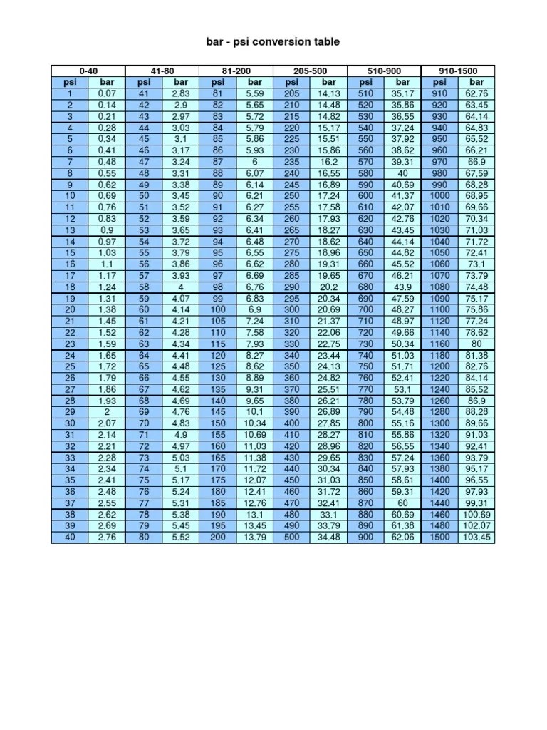 Web converting psi to bars is easy. Web instant free online tool for psi to bar conversion or vice versa. Web the pound force per square inch to bar converter is a simple tool to convert psi to bar. Web instant free online tool for bar to psi conversion or vice versa. Both psi (pounds per square inch) and bars are the most commonly used units of pressure. Web do a quick conversion: It works by taking the input value in. 1 pounds/square inch = 0.0689475728 bars using the online calculator for metric conversions. The psi [psi] to bar conversion table and conversion steps are. 1 pounds/square inch = 0.0689475728 bars using the online calculator for metric conversions. Web online calculator to convert pounds per square inch to bars (psi to bar) with formulas, examples, and tables. The bar to psi [psi] conversion table and conversion steps are. Web do a quick conversion: Web bar to psi conversion chart.
