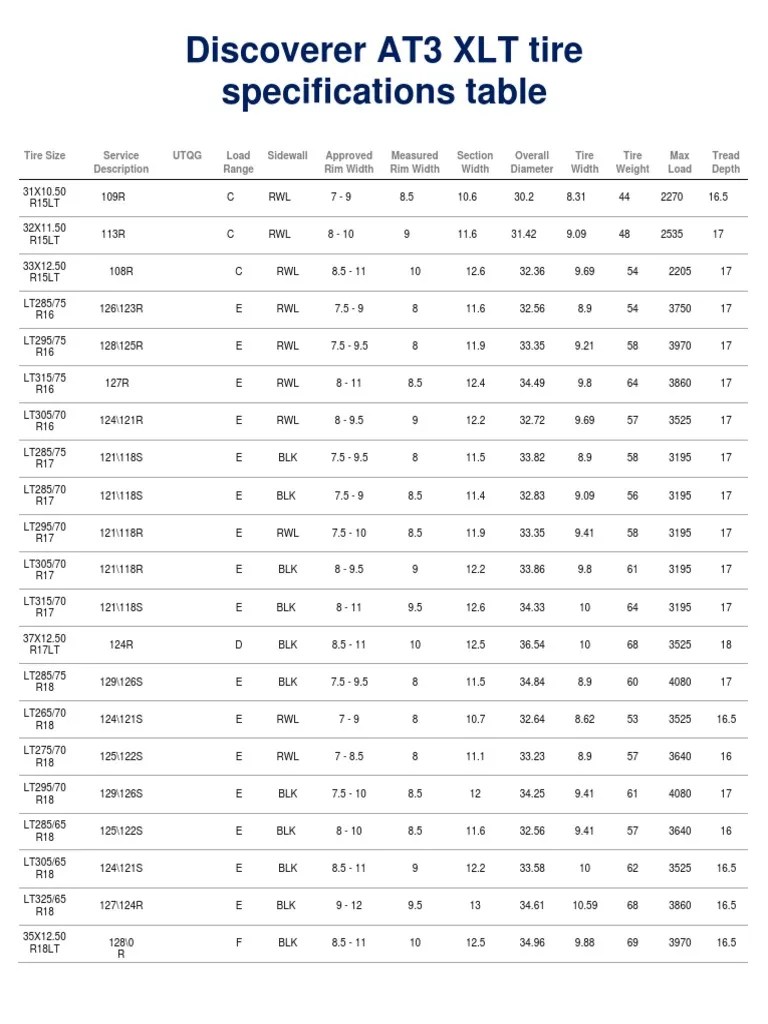 Web discoverer at3 xlt tire specifications table tire size service description utqg load range sidewall approved rim width. You can find the ideal pressure to inflate the cooper discoverer at3 xlt to using the table below. Web cooper discoverer at3 xlt tire pressure chart has a total of 33 tire sizes with a maximum tire inflation range of 35 to.