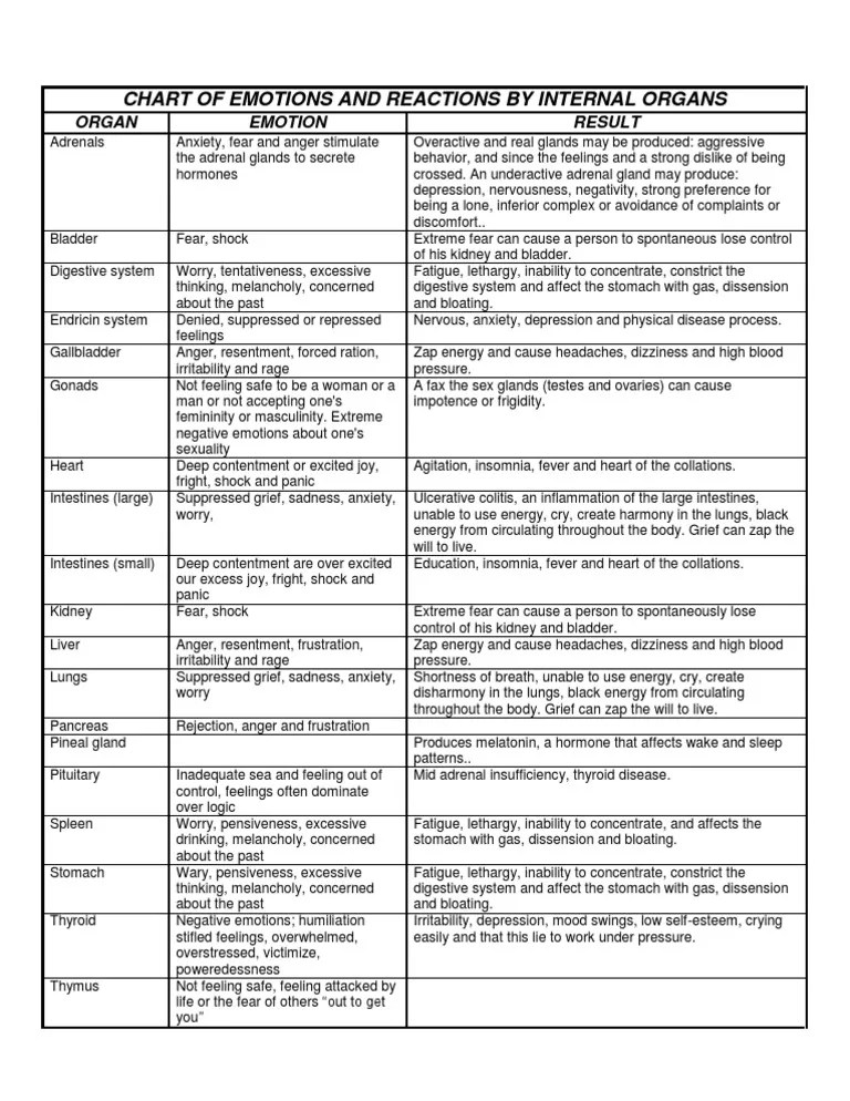 Emotions And Organs Chart