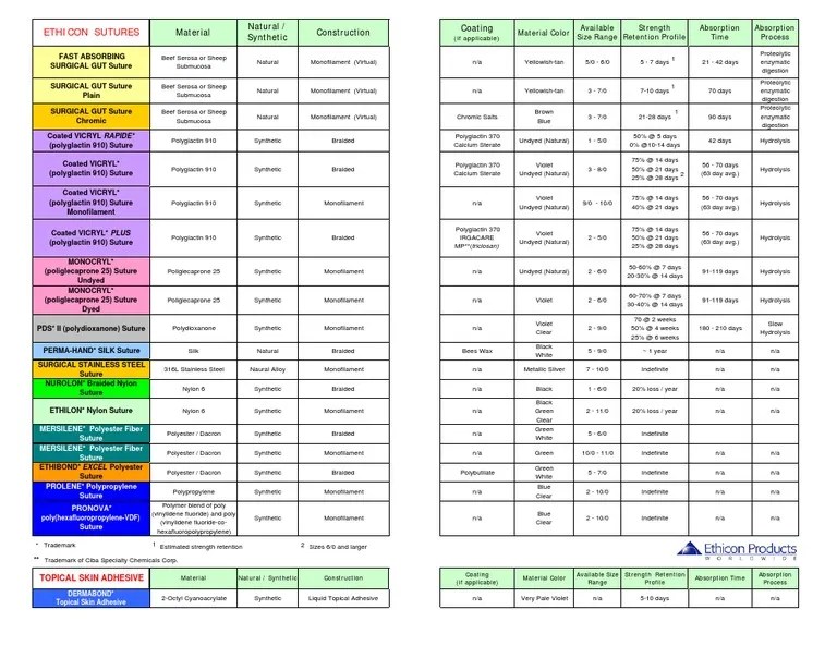 Suture Chart Ethicon Surgical Suture Chemical Substances