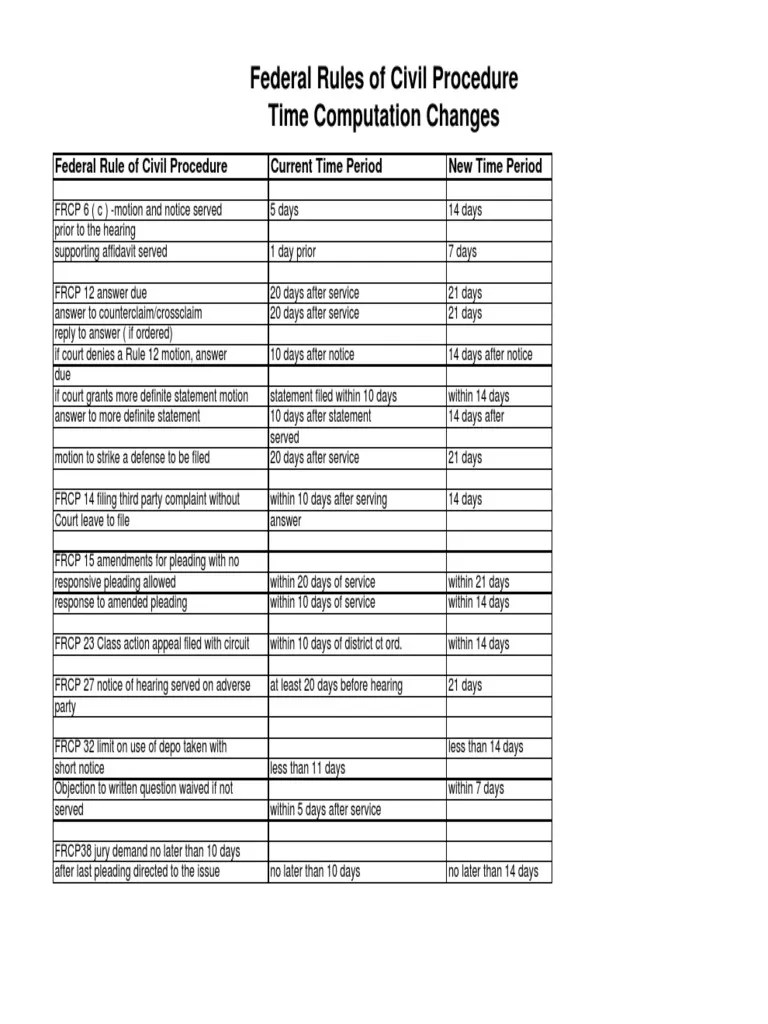 Web 84 rows these are the federal rules of civil procedure, as amended to december 1, 2023 1. Web new subdivision (a)(2) addresses the computation of time periods that are stated in hours. Web a chart of common deadlines under the federal rules of civil procedure (frcp) and various federal statutes, including. Web the federal rules of civil procedure govern.