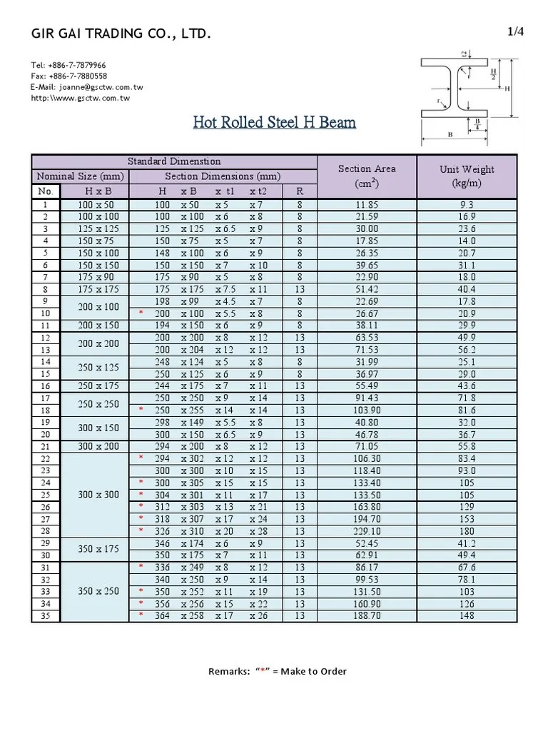 H Beam Sizes Chart