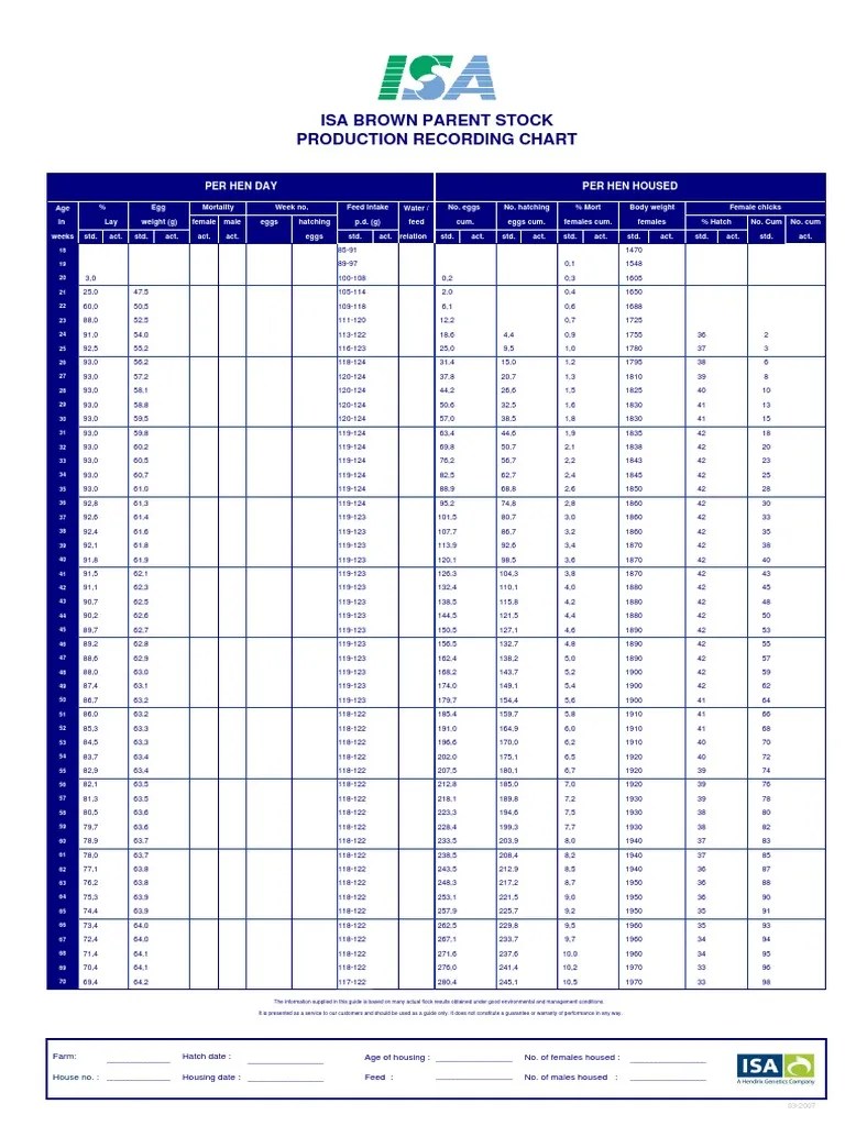 Isa Brown Parent Stock Production Recording Chart Per Hen Housed Per