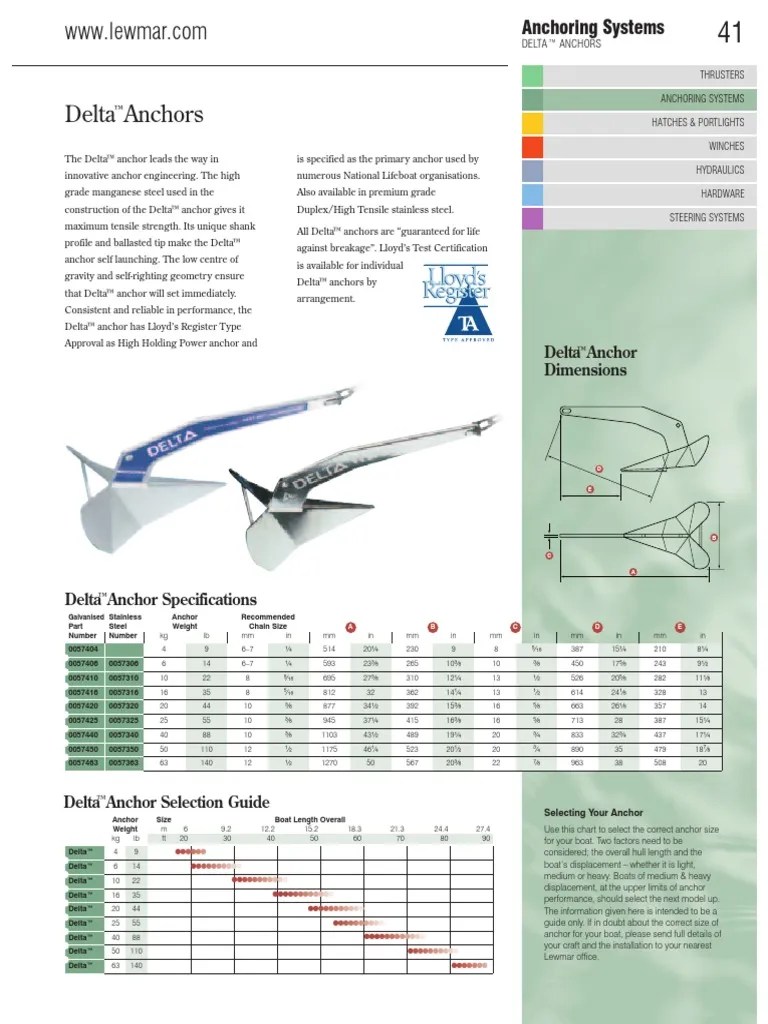 The delta anchor from lewmar leads the way in innovative anchor engineering. Web consistent and reliable in performance, the delta® anchor has lloyd's register general approval of an anchor design as a high holding power anchor and. Web delta™ 50 110 •••••••••• delta™ 63 140 ••••••• selecting your anchor use this chart to select the correct anchor size for your..