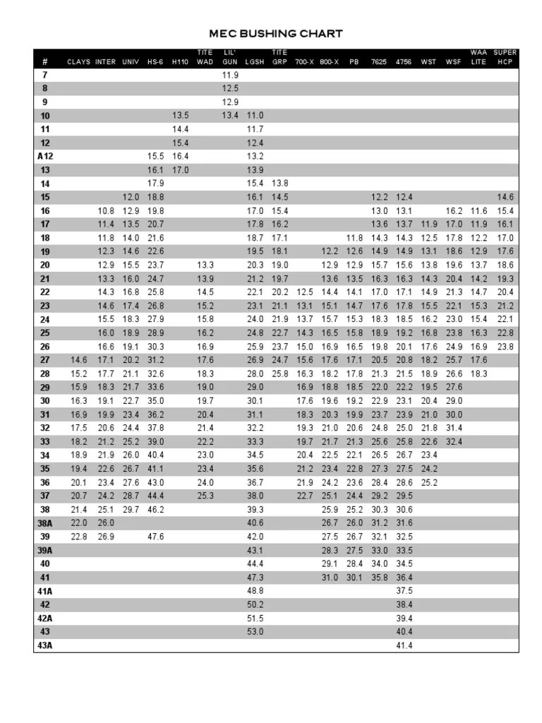 Web this brochure is meant to supply you with the information needed to select the right bar and. Web reference the mec bushing chart to verify the correct powder drop for the load you intend to use. Bushing insert to safely load the. Web i looked at the mec bushing chart and compared to the hodgdon mec bushing chart and they have wide. Web i used the chart that came with the loader to get a bushing that would give me 18.5 grains of super handicap powder. Click here to view our.