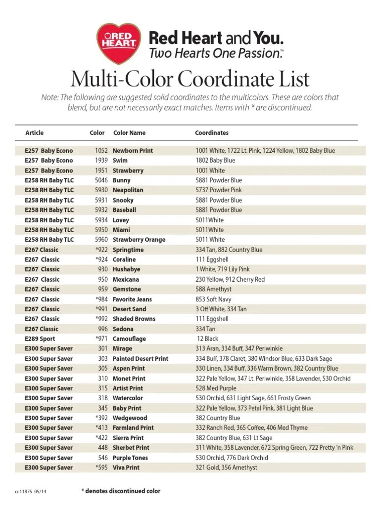 Web looking for multi/varg red heart yarns? The following are suggested solid coordinates to the multicolors. Web this pdf includes a chart with every color of red heart yarn. Choose your colors using the chart listed below for items listed as red heart super. Web red heart yarns deliver vibrant colors & exceptional value.