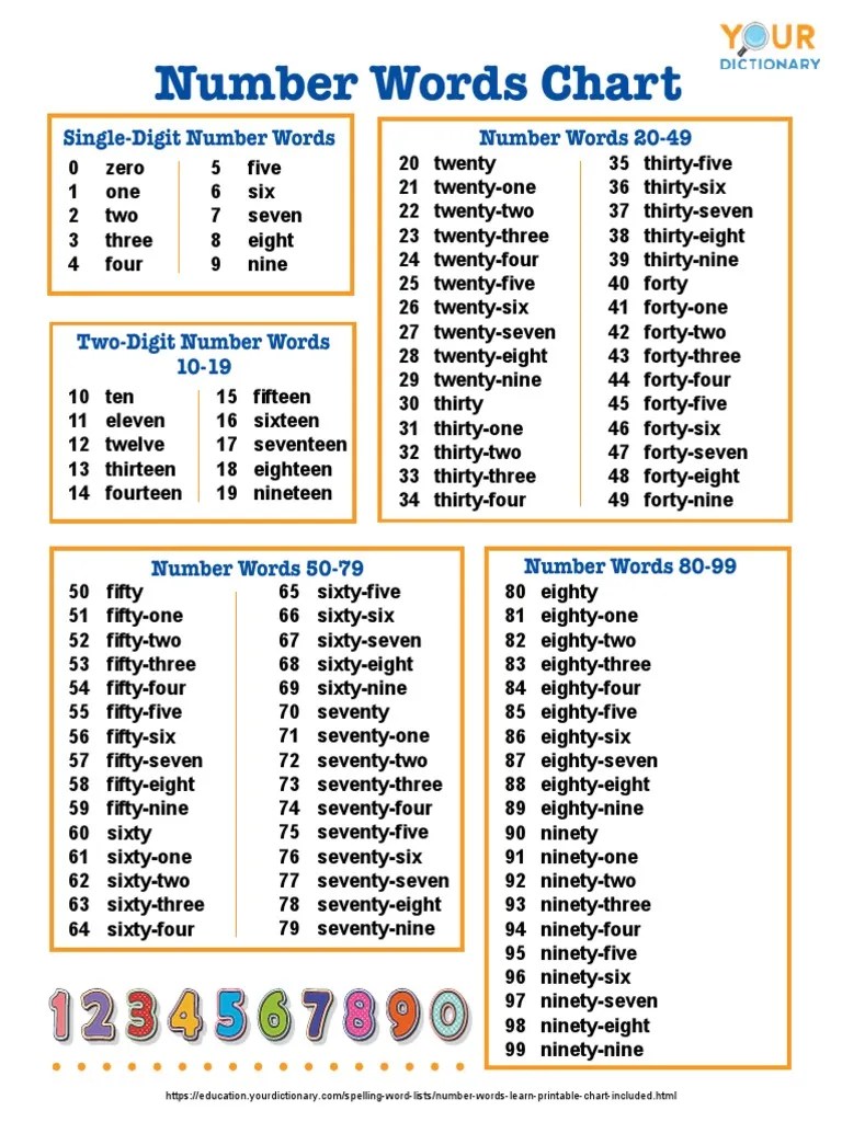 Web these free educational number word charts are just what you need to help your child remember and master reading the number. Web the goal of using this free printable number words chart is to help your child or students learn to recognize the. Web a printable chart for young learners of english showing numbers from one to a hundred with digits and words. Web this printable basic chart provides a quick snapshot of number words up to 20 and helps kids to write number names from 1 to 20. Learn to spell numbers from 1 to 100 with solved examples, faqs, 1 to 100 spelling charts, and.