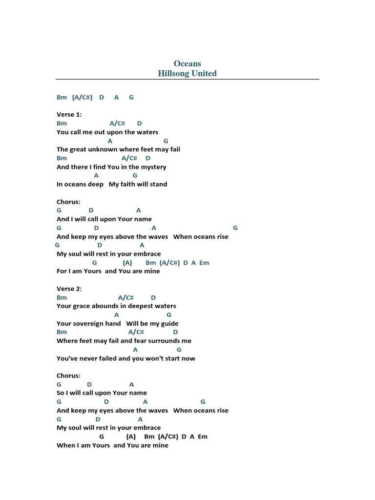 Oceans Hillsong Chord Chart - Take me deeper than my feet could ever wander and my faith will be made stronger in the presence of my savior. Web [intro] / am (g/b) c g f / [verse] / am g/b c g f you call me out upon the waters the great unknown where feet. Web intro bm a/c# d a g verse 1 bm a/c# d you call me out upon the waters a g the great unknown where feet may. Web oceans (where feet may fail) chords by hillsong united. Learn to play guitar by chords / tabs using chord diagrams, watch.