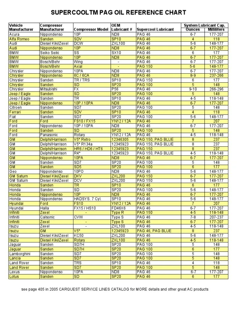 Web syndustrial pag compressor oils are highly resistant to hydrocarbon gas dilution and absorption into the gas stream. Web most 1996 and newer a/c systems use r134a refrigerant and require some type of pag (polyalkylene glycol) oil for the. Depending on the auto manufacturer, the pag to be. The compressortech range consists of over 40 vehicle manufacturers, 600 oe. Web compressor pag oil chart proair pag oils presently stocked pag proair p/n description viscosity 10 000 008 ford &. Web find the motorcraft® air conditioning refrigerant compressor oil you should use for your ford or lincoln vehicle based on. Web syndustrial pag compressor oil is highly resistant to hydrocarbon gas dilution and absorption into the gas stream.