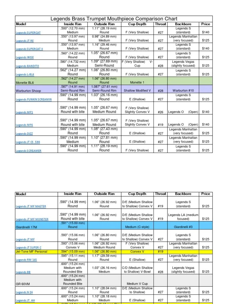 Legends Brass Trumpet Mouthpiece Comparison Chart Elementary